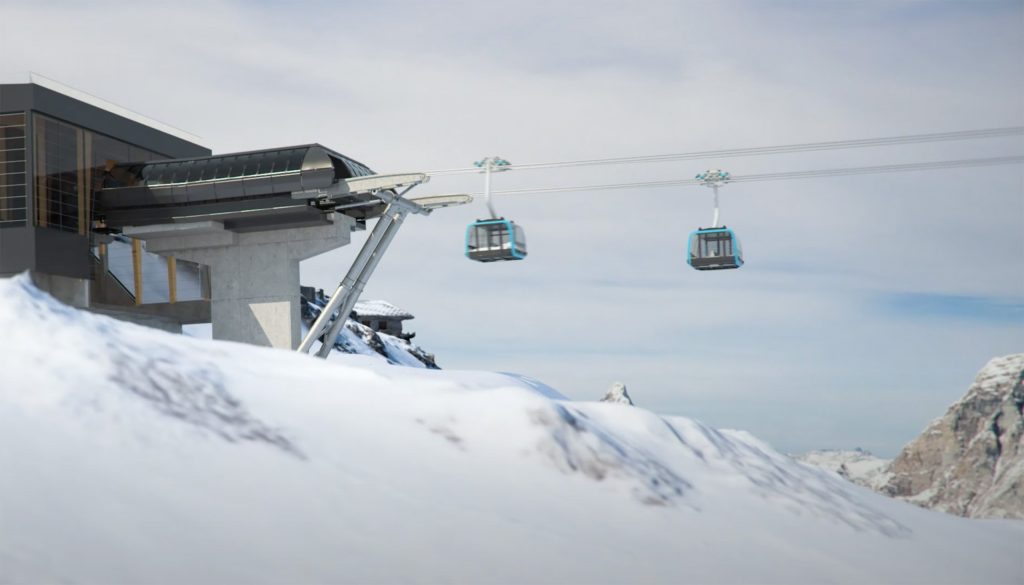The cableway connection “Plateau Rosà – Klein Matterhorn” is the realisation of a long-running dream: to tour the Mattehorn admiring the world famous pyramid-like mountain effortlessly! A visionary project, a modern tricable cableway, that will further enhance the Cervino-Matterhorn Ski Paradise’s standing as an extraordinary alpine destination all year round. This project, the highest altitude lift crossing in the Alps, will strengthen our ski resort offer and increase excursion based tourism in the area. The scenic route of one and a half hour from Italy to Switzerland or vice-versa, with an altitude difference of over 4,000 m, will be the greatest in Europe.