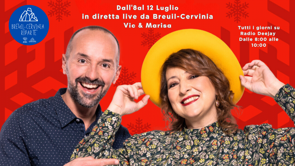 Da lunedì 8 a venerdì 19 luglio 2024, dalle 8.00 alle 10.00, Radio Deejay trasmetterà in diretta da Breuil-Cervinia. Vic e Marisa Passera porteranno buon umore e ironia agli ascoltatori direttamente dalla Casa dello Sport, nel cuore di Breuil-Cervinia, con il loro programma “Vic e Marisa”, che viene proposto in un nuovo orario mattutino.