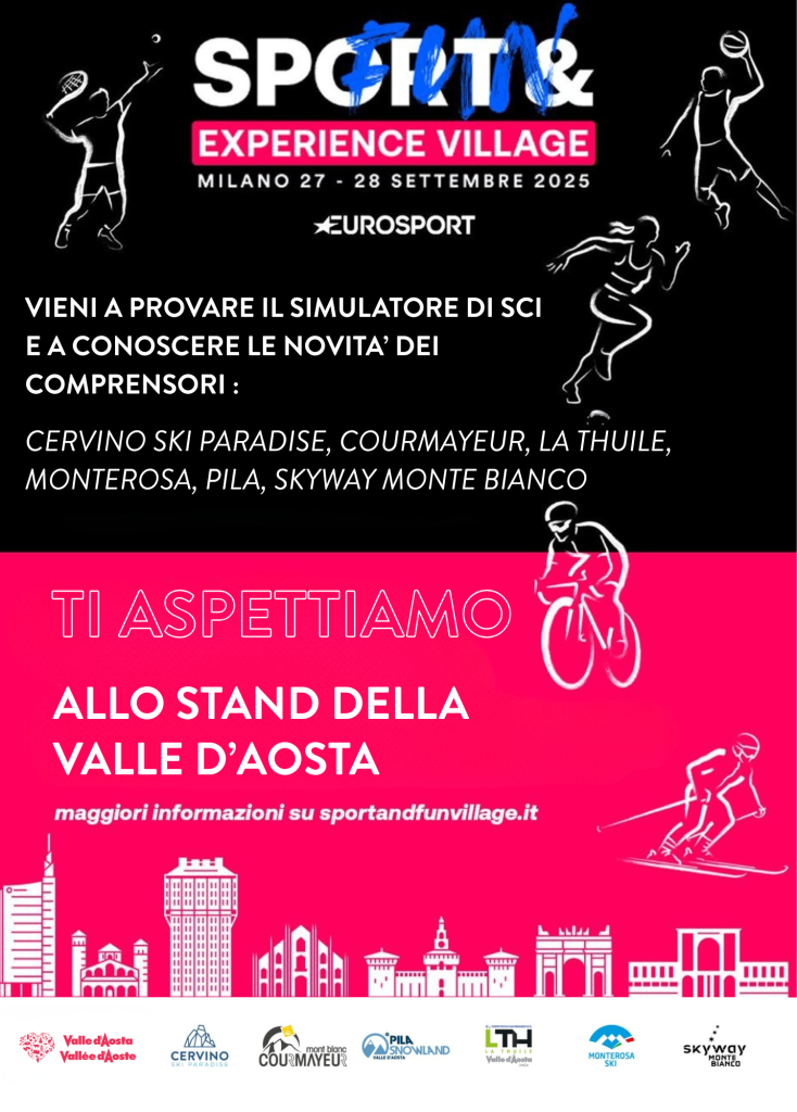 Tutte le informazioni per il pubblico - programma dell’evento, attività e iscrizioni - sono sul sito sportandfunvillage.it. Patrocinato dal comune di Milano, lo Sport&Fun Experience Village è realizzato con DR auto, Fastweb + Vodafone, FitActive, Nintendo, Perfetti con Big Babol e i Comprensori della Valle d’Aosta (Cervino Ski Paradise, Courmayeur, La Thuile, Monterosa, Pila, Skyway Monte Bianco) sponsor dell’evento.