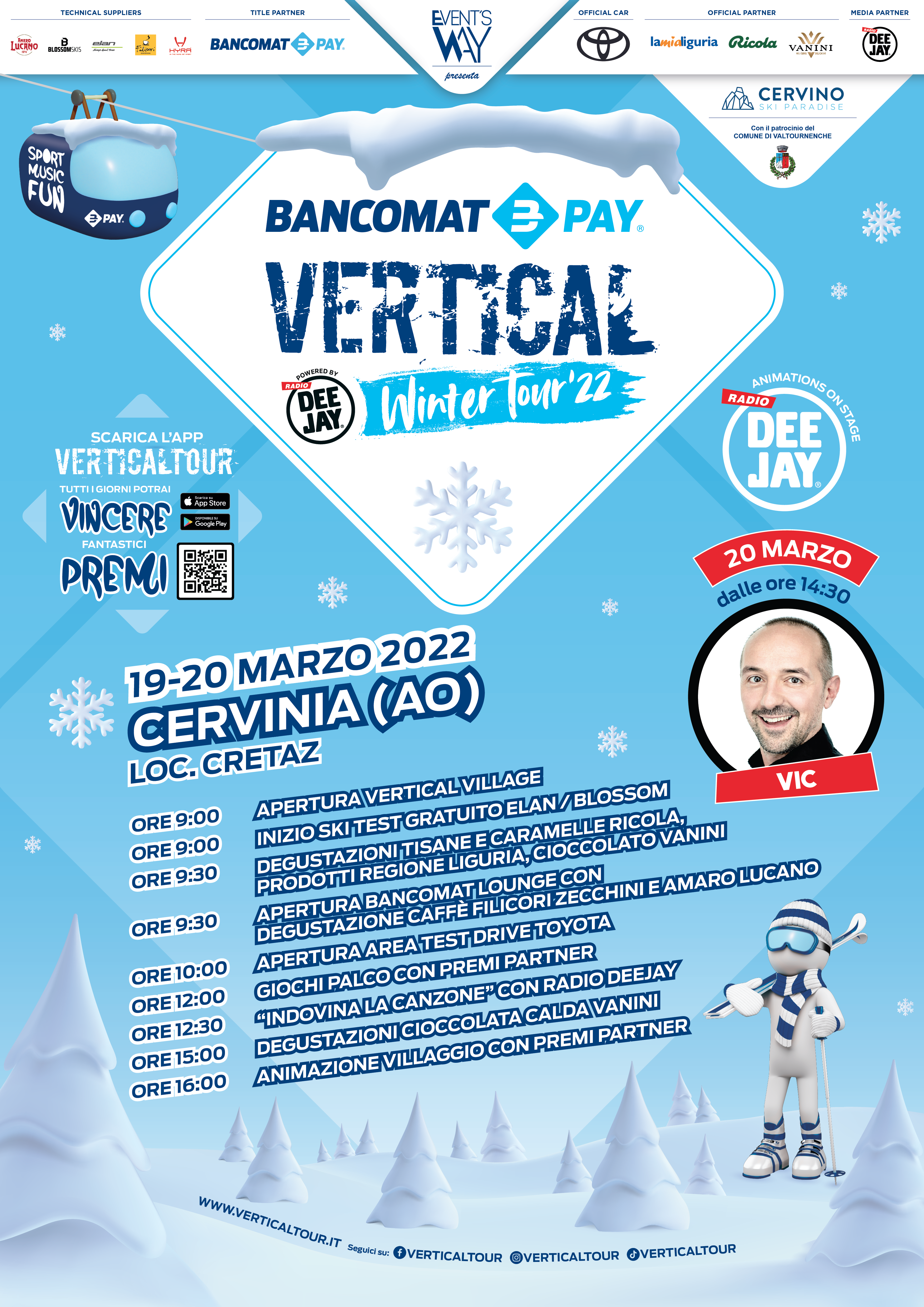 Vertical Tour vivrà anche su una fantastica App che contiene tutte le informazioni aggiornate sul calendario e le attività in corso, con la possibilità di scattare foto per successiva condivisione e soprattutto rappresenta il punto di accesso privilegiato al grande concorso con i premi messi in palio ogni giorno dai partner, come i cappellini di Radio Deejay e quelli griffati Vertical, in attesa della grande estrazione finale del 15 marzo che metterà in palio un paio di sci Elan, una giacca da sci Hyra e un kit viaggio & benessere offerto da Ricola, composto da un trolley e 3kg di caramelle.