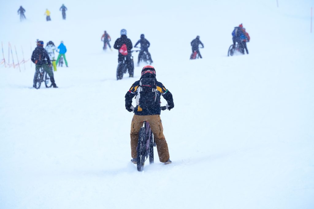 Aria frizzante a pizzicare il viso e le mani, nebbia, luce piatta e grandi fiocchi di neve: la primavera sembra ancora lontana a Breuil-Cervinia, dove ieri – sabato 21 marzo – poco più di un centinaio di appassionati si sono ritrovati per il Cervino Snow Bike Show. Le condizioni meteo del tardo pomeriggio hanno reso ancora più impegnativa e spettacolare la discesa sulla neve in sella alla bicicletta, trasformando la sfida in un’esperienza epica, affascinante e, inevitabilmente, punteggiata da qualche ruzzolone morbido nella neve fresca.
