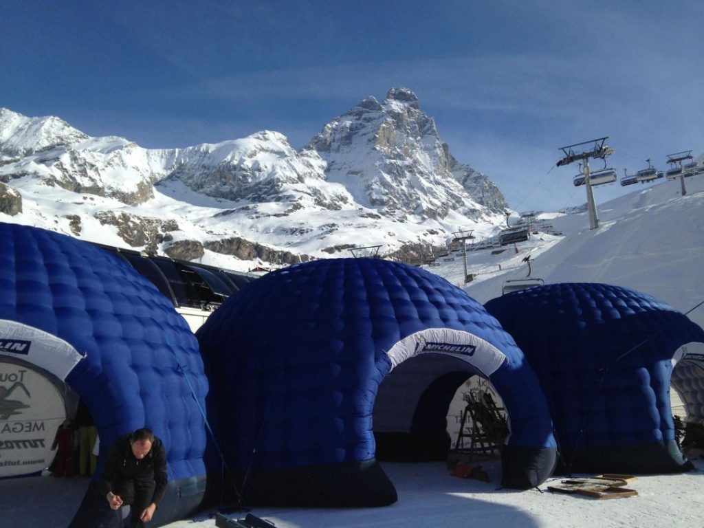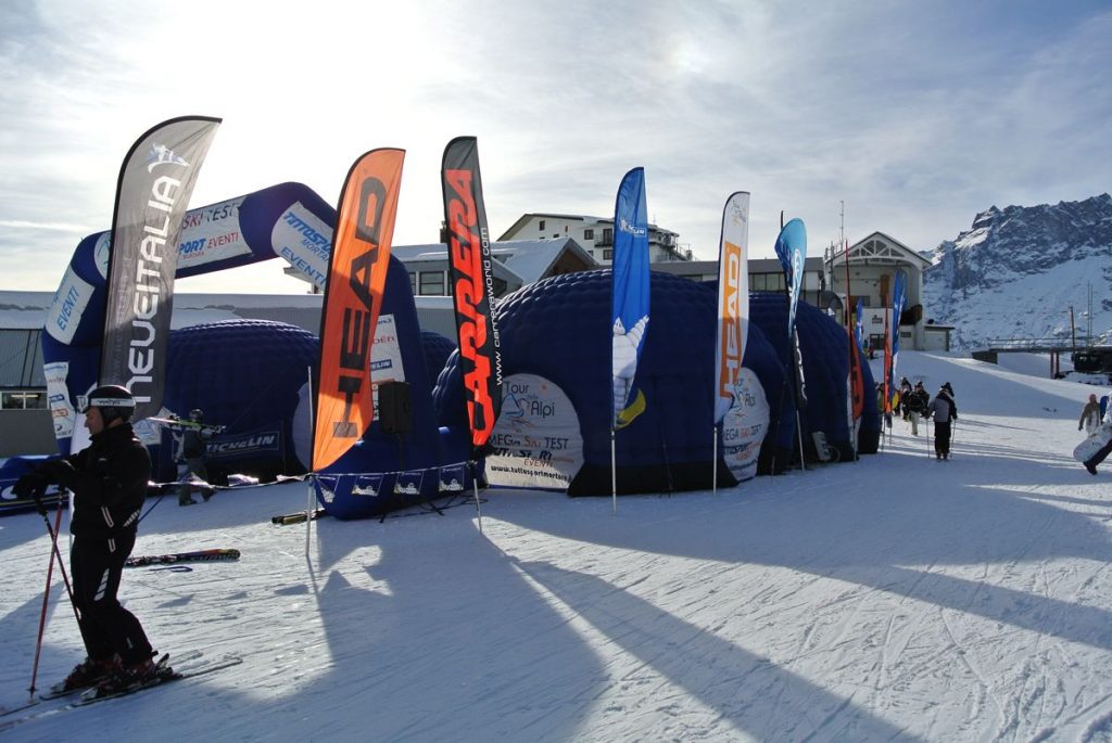 Ski Test and village will be in Plan Maison in a splendid setting, consisting of inflatable chalets, the Tour of the Alps offers HEAD skis, DAINESE protections, helmets and BOLLE masks to be tested.